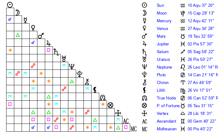 | Venus | 27 Aquarius 35 | 27 Pisces 3 | 26 Gemini 42 |