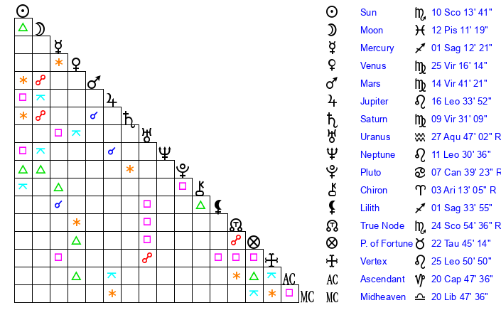 | Sun | 10 Scorpio 13 | 11 Scorpio 31 | 27 Aquarius 45 |