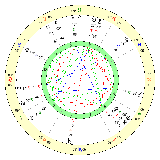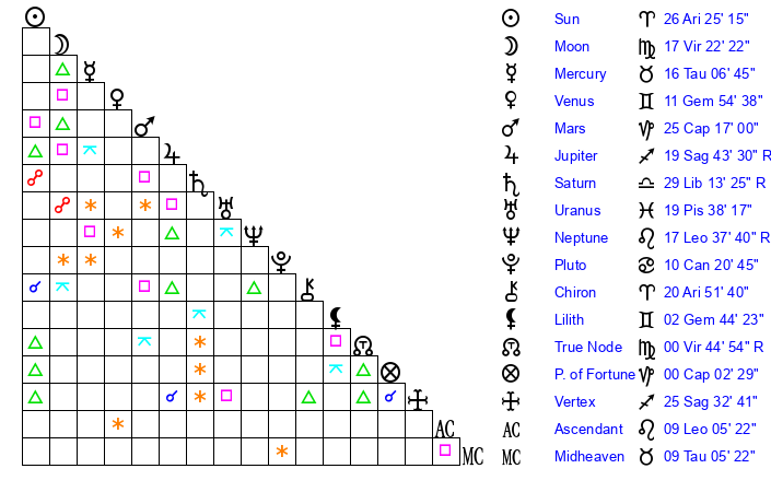 | Moon | 17 Virgo 24 | 7 Sagittarius 6 | 6 Gemini 38 |