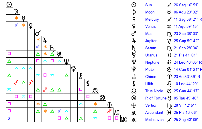 | Saturn | 21 Scorpio 56 | 25 Pisces 26 | 26 Scorpio 10 |