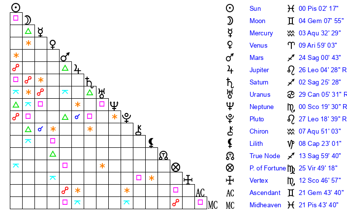 | Neptune | 0 Scorpio 19 | 28 Pisces 33 | 28 Libra 47 |