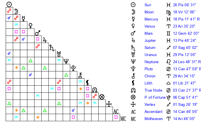 | Moon | 18 Virgo 7 | 4 Scorpio 33 | 18 Aries 5 |