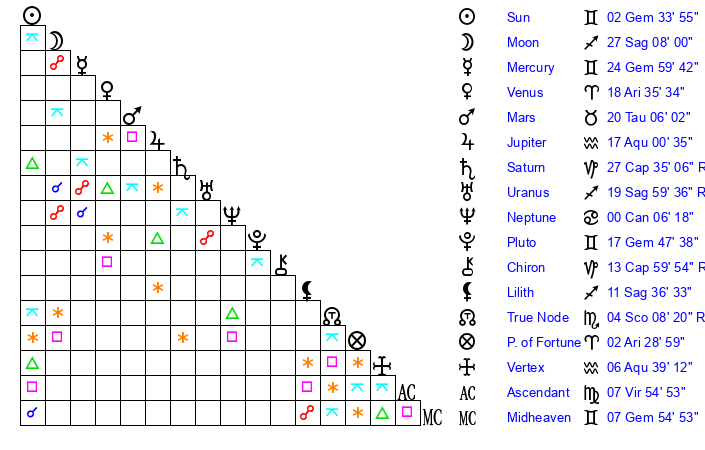 | Pluto | 17 Gemini 48 | 3 Aquarius 43 | 19 Gemini 42 |