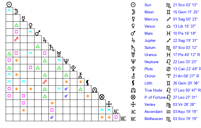 | Sun | 21 Scorpio 3 | 21 Scorpio 34 | 3 Pisces 35 |