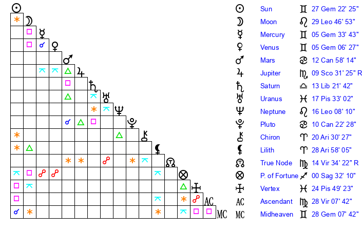 | Sun | 27 Gemini 22 | 28 Gemini 40 | 5 Libra 31 |