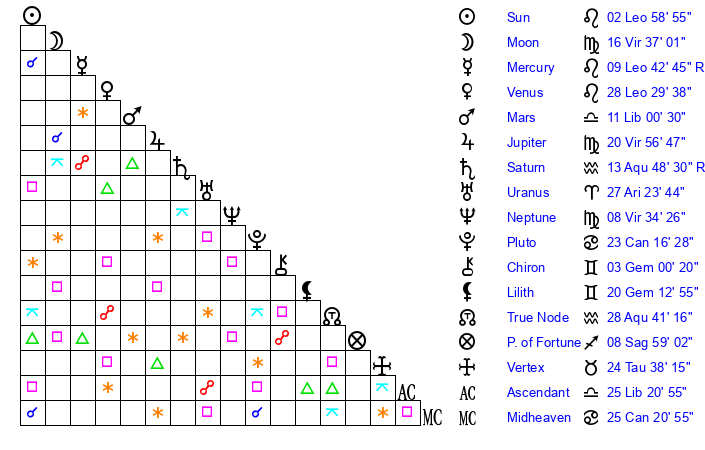 | Moon | 16 Virgo 42 | 24 Leo 29 | 9 Aquarius 18 |