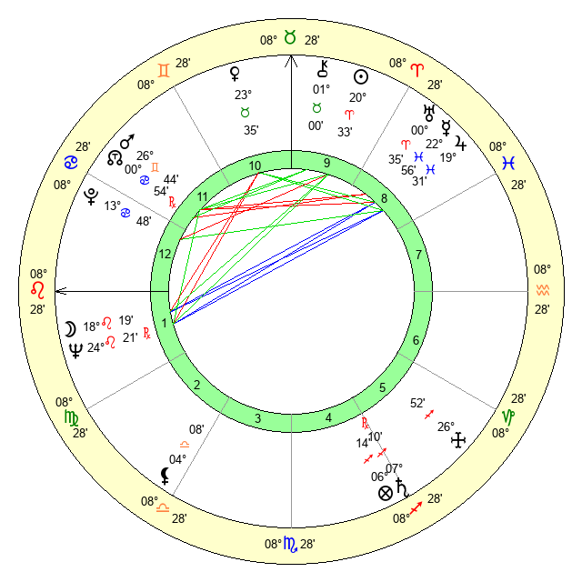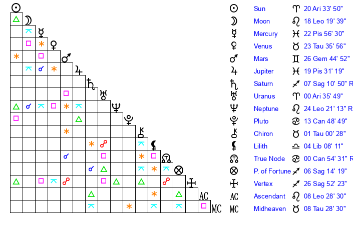 | Moon | 18 Leo 19 | 4 Libra 45 | 12 Pisces 38 |