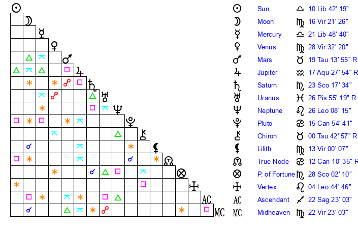 | Saturn | 23 Scorpio 45 | 27 Pisces 22 | 4 Sagittarius 44 |