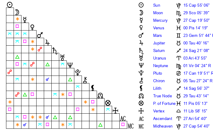 | Saturn | 24 Sagittarius 40 | 14 Pisces 55 | 0 Capricorn 50 |