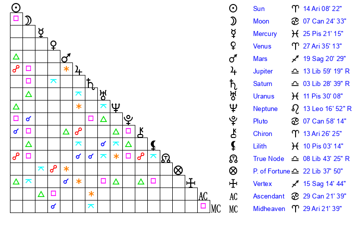 | Moon | 7 Cancer 27 | 10 Cancer 26 | 17 Aries 37 |
