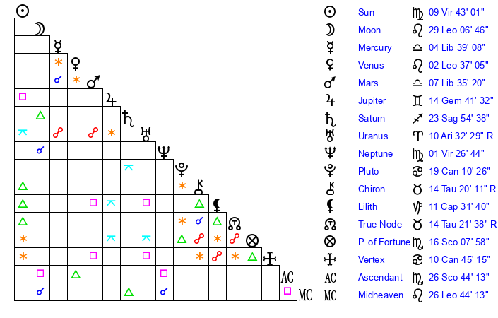 | Venus | 2 Leo 37 | 9 Leo 36 | 0 Sagittarius 31 |