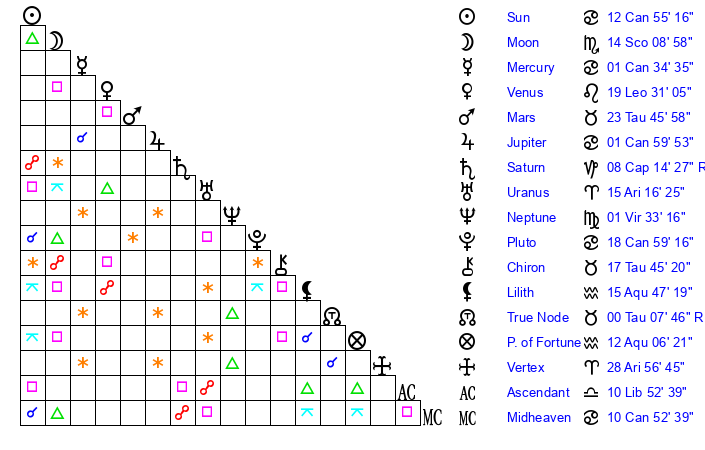 | Sun | 12 Cancer 55 | 13 Cancer 55 | 14 Libra 41 |