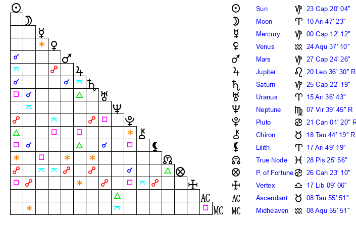 | Mercury | 0 Capricorn 12 | 9 Capricorn 9 | 15 Aries 55 |