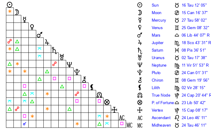| Sun | 16 Taurus 12 | 17 Taurus 23 | 12 Leo 19 |