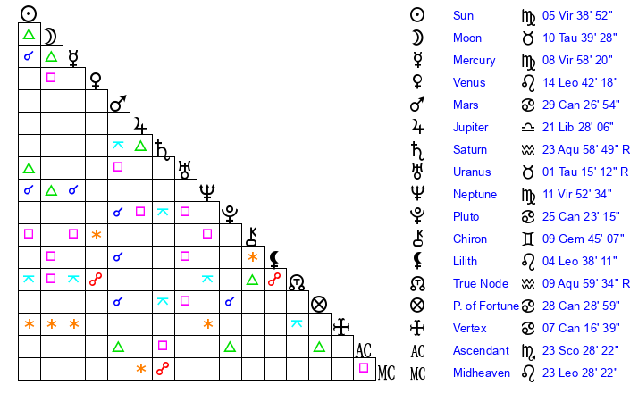 | Sun | 5 Virgo 39 | 6 Virgo 36 | 5 Sagittarius 47 |