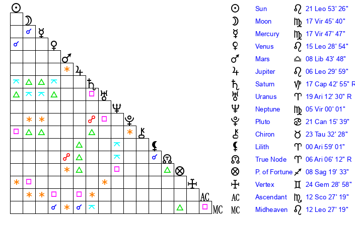 | Neptune | 5 Virgo 0 | 1 Aries 43 | 7 Virgo 50 |