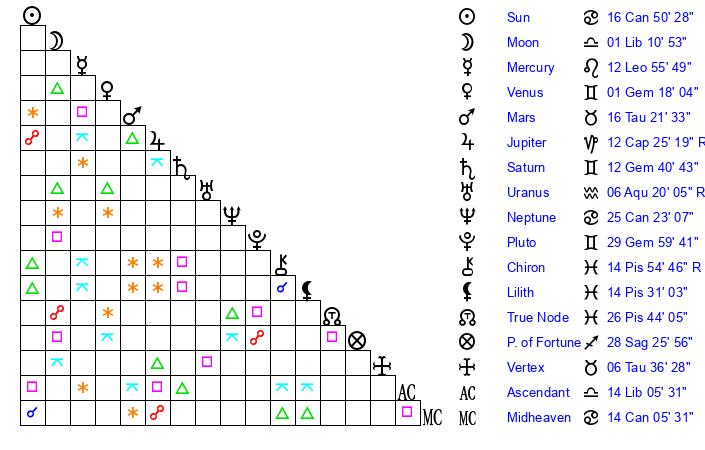 | Saturn | 13 Gemini 17 | 1 Aries 48 | 18 Gemini 10 |