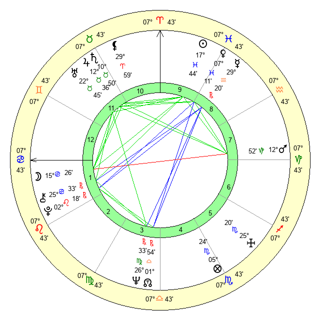 | Moon | 15 Cancer 20 | 13 Cancer 43 | 12 Leo 43 |