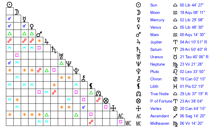 | Moon | 18 Aquarius 12 | 3 Scorpio 59 | 5 Aries 57 |