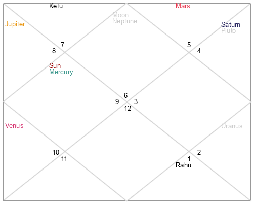 | Ketu | 20 Scorpio 40 | 12 Virgo 1 | 16 Scorpio 32 |