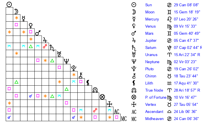 | Moon | 15 Gemini 14 | 2 Cancer 37 | 19 Sagittarius 43 |