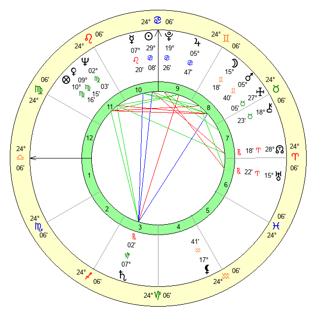 | Sun | 29 Cancer 8 | 0 Leo 8 | 1 Scorpio 33 |