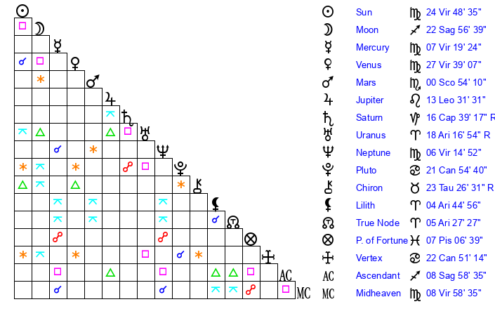 | Sun | 24 Virgo 48 | 26 Virgo 2 | 28 Sagittarius 52 |