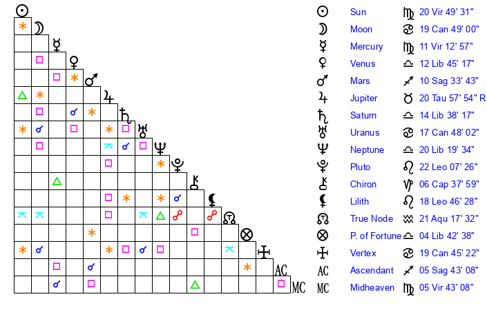 | Sun | 20 Virgo 49 | 21 Virgo 9 | 3 Sagittarius 23 |