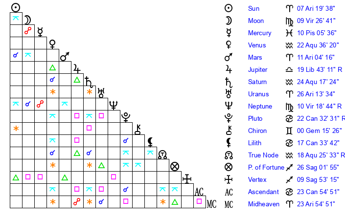 | Sun | 7 Aries 19 | 8 Aries 16 | 5 Cancer 20 |