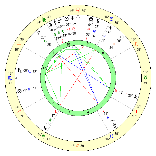 | Moon | 10 Virgo 6 | 26 Cancer 17 | 16 Taurus 33 |