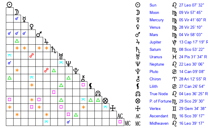 | Moon | 10 Virgo 6 | 26 Cancer 17 | 16 Taurus 33 |
