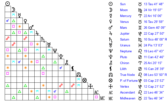 | Sun | 13 Taurus 42 | 14 Taurus 29 | 19 Leo 26 |