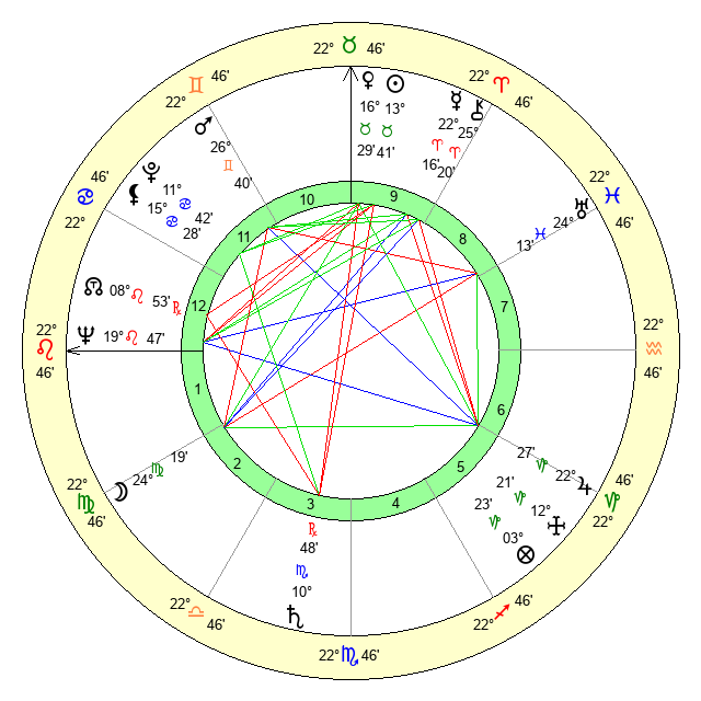 | Neptune | 19 Leo 47 | 1 Aries 12 | 22 Leo 12 |