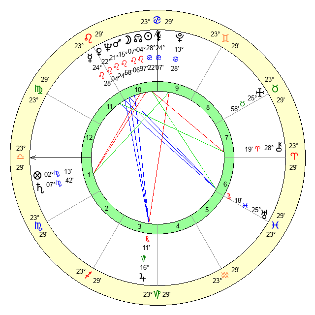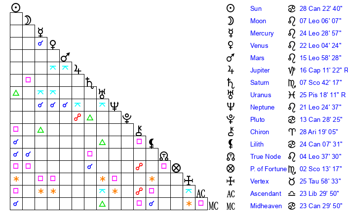 | Sun | 28 Cancer 23 | 29 Cancer 11 | 5 Scorpio 46 |