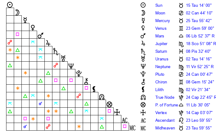| Sun | 15 Taurus 14 | 16 Taurus 25 | 11 Leo 22 |