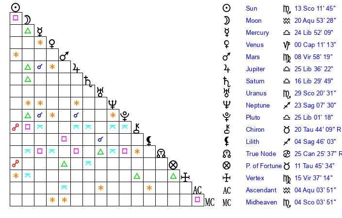Sun | 13 Scorpio 12 | 13 Scorpio 46 | 26 Sagittarius 42 |
