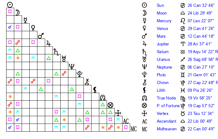 | Sun | 26 Cancer 33 | 27 Cancer 16 | 24 Scorpio 56 |