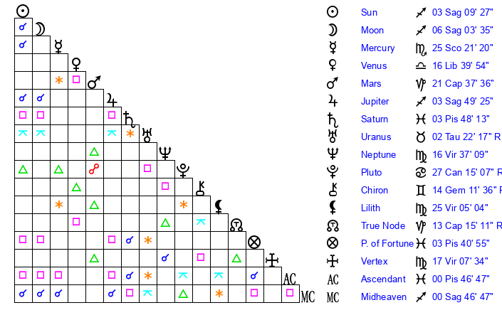 | Moon | 6 Sagittarius 7 | 11 Aquarius 32 | 26 Pisces 42 |