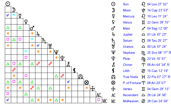 | Moon | 14 Capricorn 23 | 10 Virgo 48 | 3 Aquarius 16 |
