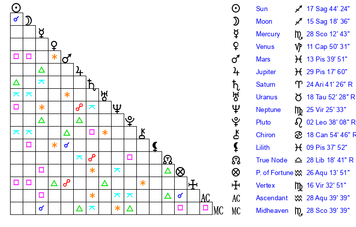 | Sun | 17 Sagittarius 44 | 18 Sagittarius 53 | 14 Pisces 59 |
