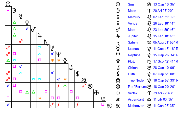 | Moon | 20 Aries 15 | 15 Scorpio 30 | 26 Cancer 8 |