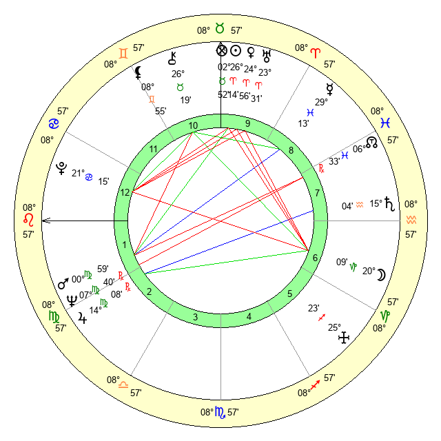 | Venus | 24 Aries 57 | 24 Pisces 54 | 17 Leo 52 |