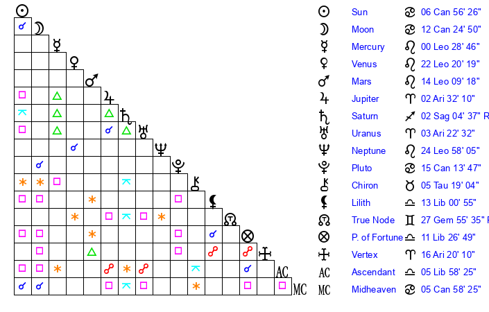 | Sun | 6 Cancer 56 | 8 Cancer 12 | 11 Libra 27 |