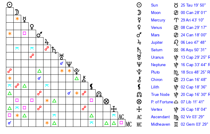 | Moon | 0 Cancer 25 | 10 Capricorn 50 | 4 Libra 29 |