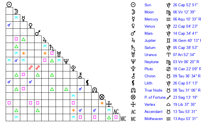 | Venus | 22 Capricorn 5 | 14 Pisces 48 | 20 Taurus 26 |