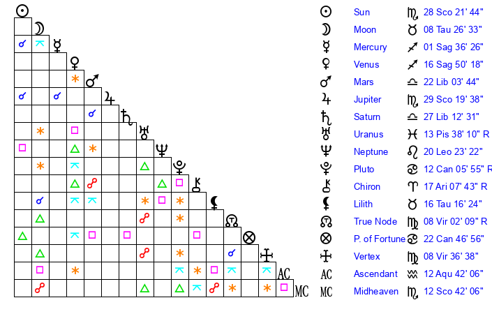 | Moon | 8 Taurus 26 | 15 Sagittarius 11 | 5 Aquarius 33 |