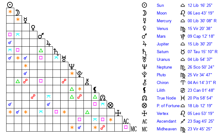 | Neptune | 26 Scorpio 50 | 0 Aries 24 | 28 Scorpio 48 |