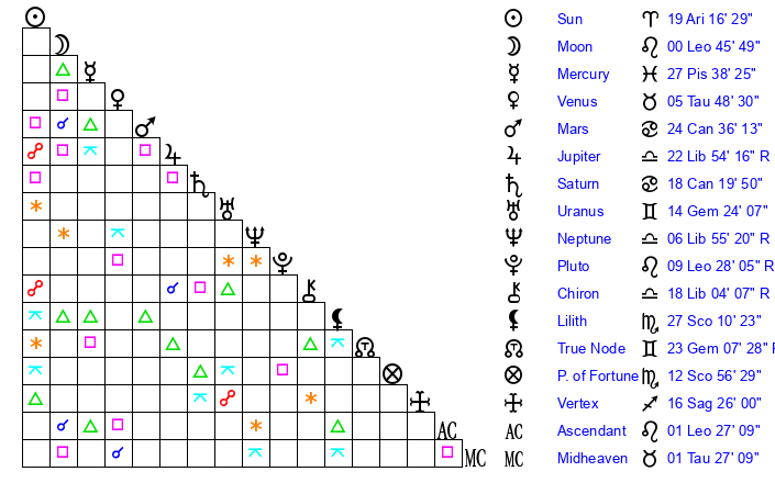 Sun | 19 Aries 17 | 20 Aries 8 | 5 Cancer 28 |