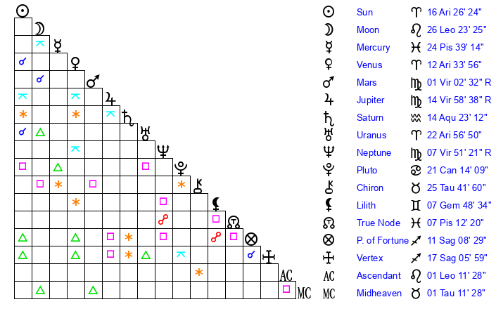 | Venus | 12 Aries 34 | 25 Pisces 27 | 5 Leo 40 |