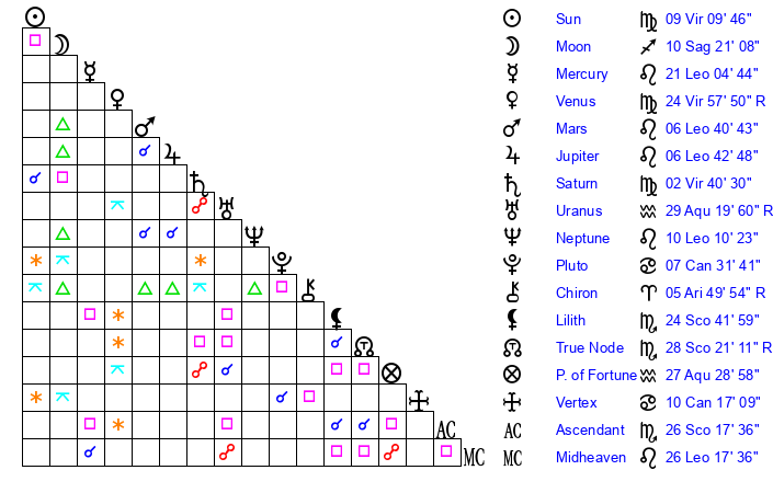 | Sun | 9 Virgo 9 | 10 Virgo 28 | 24 Sagittarius 43 |